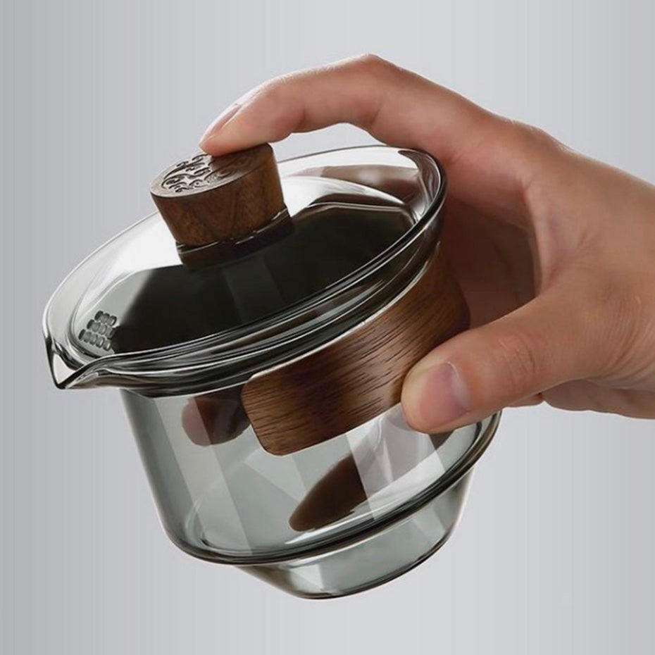 Original accessory for tea brewing - gaiwan-teapot. It is made of heat resistant black glass with wooden elements - a rim and a top with a pattern.